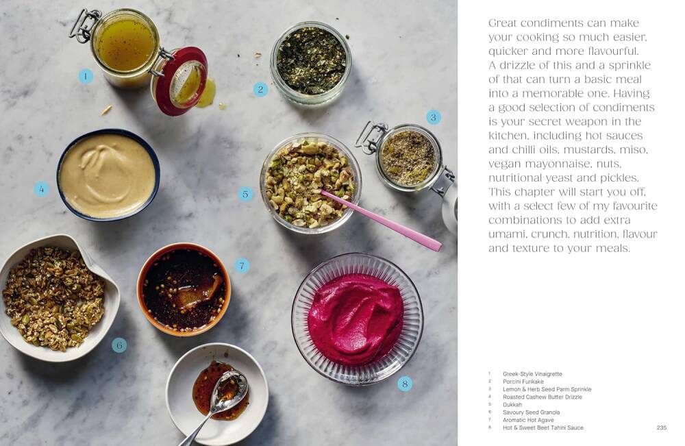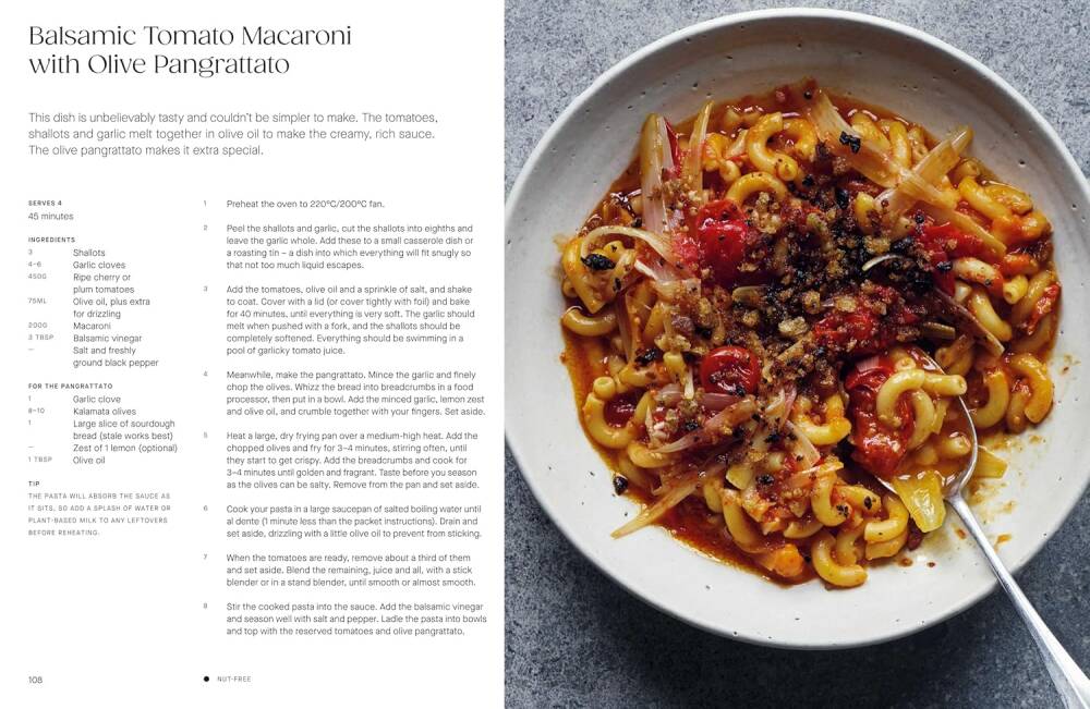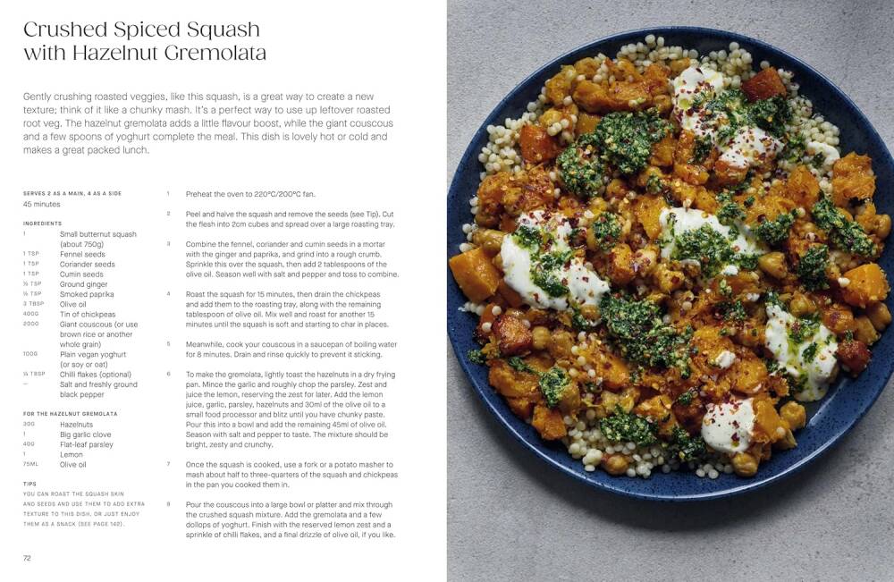Besleyici, canlı yemekler ve daha fazlası. Spicy Mushroom Skewers with Peanut Lime Sauce (Acılı Mantar Şişler ve Yer Fıstığı Limon Sosu), Tahinli Tereyağlı Nohutlu Tatlı Patatesler, Fıstık Kremalı ve Yer Fıstığı Soslu Vişneli Semifreddo ile Çekilmiş Pırasa gibi tarifler dahil. Ayrıca temel malzemeler, vegan mitlerini çürütme ve paradan tasarruf etme ile ürünleri daha uzun süre taze tutma ipuçlarına dair ekstra bilgiler de yer alıyor.