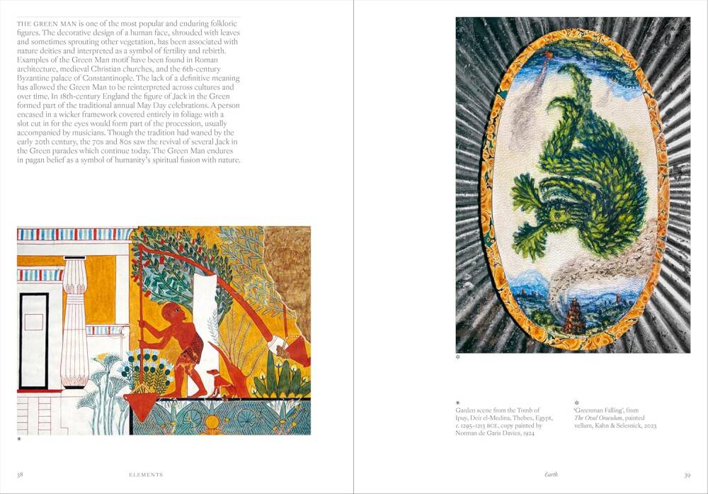 Robert Fludd’un (1574–1637) elementlerin düzenine dair sunumunu takiben, Ellcock okuyucuları toprak, su, hava ve ateş üzerinden yükselen ve en nihayetinde en spiritüel unsur olan göksel etere ulaşan olağanüstü bir görsel seçkiyle rehberlik eder. Doğu felsefelerindeki beş elementle, çakralar, akupunktur ve Çin astrolojisiyle ilişkilerini de ortaya koyar. Giriş metinleri, elementlerin Dünya ve göklerin bileşenlerini ve insanlıkla ilişkilerini, 2.000 yıl önce Pers peygamberi Zerdüşt tarafından ilk önerildiği zamandan bu yana nasıl tanımladığını inceler. Sayfalarda yer alan bilgilendirici metin panelleri temel kavramları aydınlatırken; edebiyat, felsefe ve spiritüel alıntılar, olağanüstü görsellerin arasına serpiştirilmiş şekilde eserin genel temalarına dair ek yorumlar sunar.