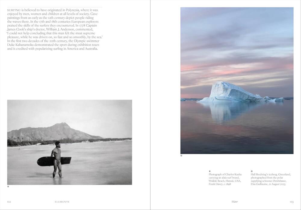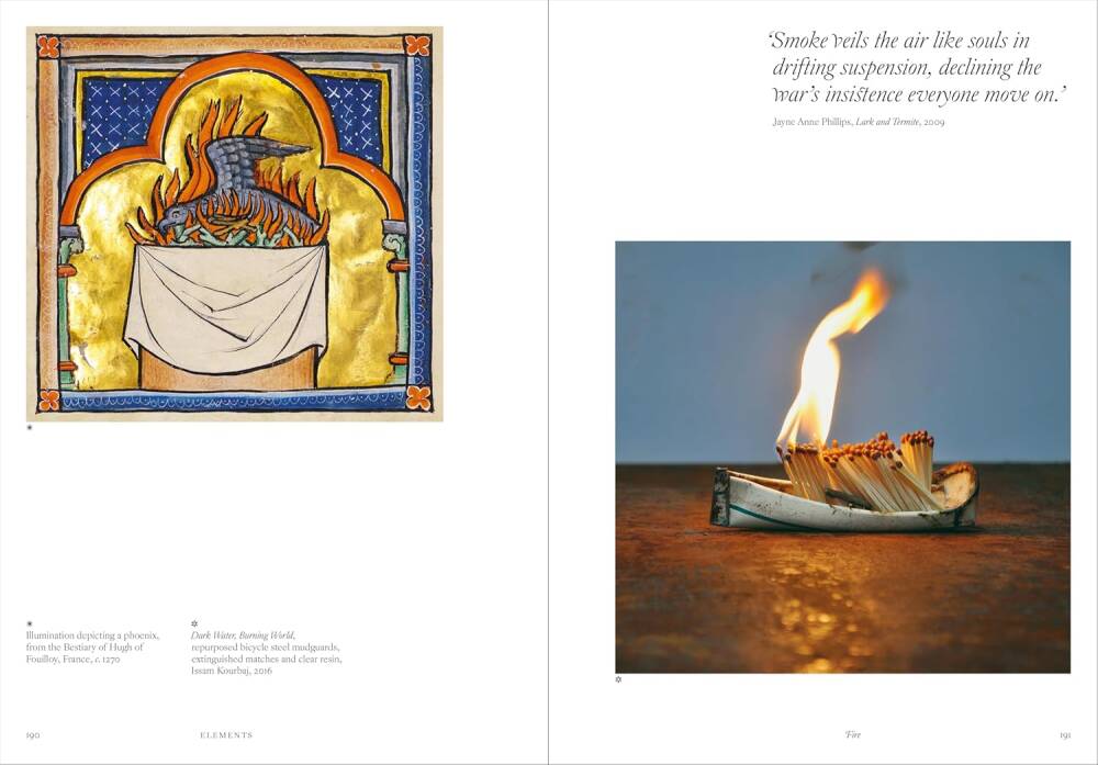 Elements, antik filozoflardan simyacılara, astrologlardan modern sanatçılara, fotoğrafçılardan bilim insanlarına kadar, elementlerin derin anlamlarını ortaya koyan imgeleri keşfeden eklektik, etkileyici ve çarpıcı bir görsel hazinedir. Stephen Ellcock tarafından tematik olarak küratörlüğü yapılan eser, modern ve vizyoner görüntüleri antik ve gizemli imgelerle yan yana getirir; elementlerin yaratıcı güçleri ile yıkıcı etkileri karşılaştırılır; elementlerin mevsimler, beden sıvıları, burçlar ve bedenin parçalarıyla bağlantıları açığa çıkarılır.