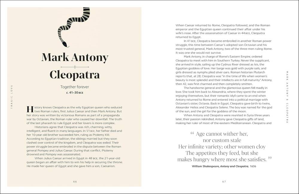 Great Loves, tarihin en ünlü romantik ilişkilerini—neşeli, trajik ve epik—tek bir çarpıcı görsel rehberde sunarak, yaş, ırk, cinsiyet veya yönelim fark etmeksizin, aşkın her zaman güçlü bir kuvvet olduğunu gösteriyor.