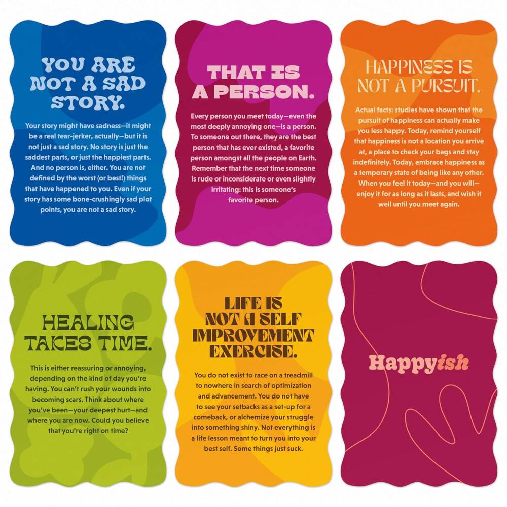 McInerny, sınırsız mutluluk peşinde koşmaktan yorulmuş ve daha istikrarlı bir ruh hali olan “biraz mutlu” (happyish) olmayı kabul etmeye hazır olanlar için günlük bir kehanet/rehber kart destesi hazırladı. Her kart, hayat karanlıkla dolduğunda McInerny’nin kendisinin güvendiği faydalı düşünceleri temsil ediyor—örnekler: “Hayat bir kendini geliştirme egzersizi değildir,” “Sen üzücü bir hikaye değilsin,” ve “Bırak karmaşık olsun.”