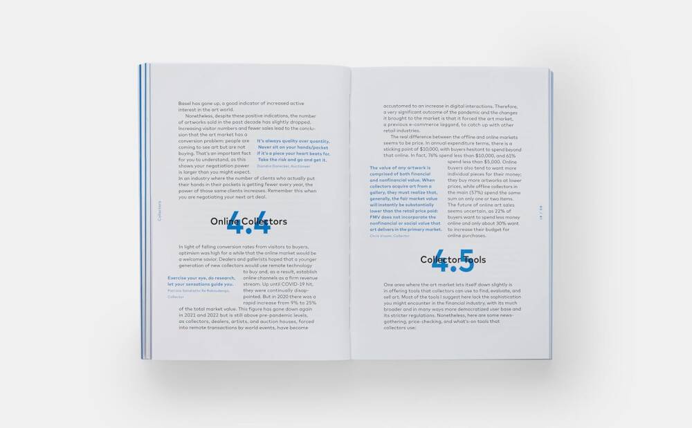 Magnus’un koleksiyon oluşturma tavsiyelerine ek olarak kitapta; mega koleksiyonerler Shelley ve Philip Aarons, Beth Rudin DeWoody, Jorge M. Pérez, Howard E. Rachofsky, Komal Shah gibi isimlerin; müze direktörleri Adam Weinberg ve Heidi Zuckerman’ın; sanat fuarı kurucusu Touria El Glaoui’nin; mega sanat tüccarları Marc Glimcher, Adam Lindemann, Jeffrey Deitch, Simon de Pury’nin; önde gelen küratör Hans Ulrich Obrist’in; sanat danışmanı Amy Cappellazzo’nun ve sanatçı Julian Schnabel’ın sözleri ve vaka çalışmaları yer alıyor. Kitap ayrıca önemli koleksiyoner Pamela Joyner tarafından yazılmış bir önsöz içeriyor.