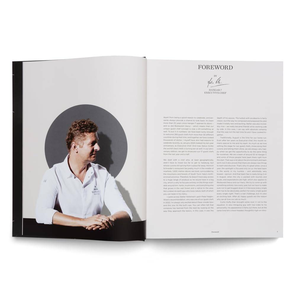 Yirmi yıllık Hangar-7 ve dolayısıyla Restaurant Ikarus’un varlığını kutlayan bu özel cilt, konuk şeflerin çeşitliliği ve prestiji ile dikkat çekiyor: İki yıldızlı şef Curtis Duffy, heyecan ve gerilim dolu mutfağıyla Hangar-7’e rock ‘n’ roll getiriyor; üç yıldızlı şef Kevin Fehling ise konuklarını kişisel bir atmosferde tek bir masada ağırlıyor. Ayrıca ABD’de gastronominin öncülerinden biri haline gelmiş büyük bir Avusturyalı şef de konuk olarak Restaurant Ikarus’un yolunu buldu: Wolfgang Puck.