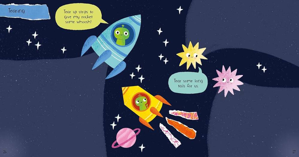 16 basit sahne, kesip yapıştırmak veya koparmak için hazırlanmış 8 sayfa resim ve dokular ile süslenmeye hazır çeşitli sevimli hayvanlar, bitkiler ve insanları gösterir. Bu kitap makas veya yapıştırıcı içermez, ancak farklı kağıt türlerini kesme, yırtma ve yapıştırma talimatlarını açıklayan net yönergeler içerir.