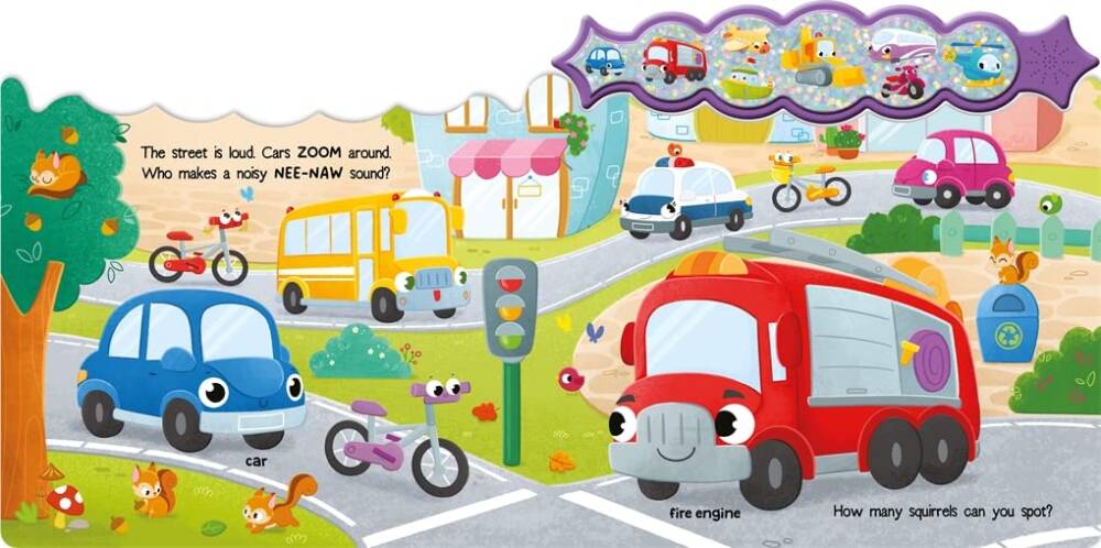 Düğmelere basarak VROOM’dan NEE-NAW’a kadar 8 heyecan verici araç sesini keşfedin. Her sayfada keşfedecek çok şeyle dolu bu kitap, araçları tanımak için mükemmel bir başlangıçtır.