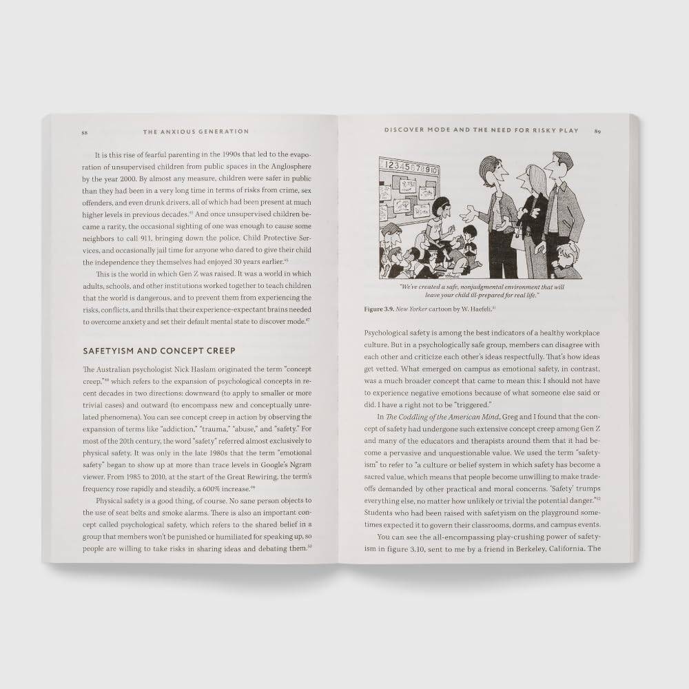 Bu kitapta Haidt, oyun temelli çocukluğun kaybının ve onun yerine insan gelişimi için uygun olmayan telefon temelli bir çocukluğun geçmesinin, gençler arasında artan ruhsal sıkıntının kaynağı olduğu konusunda ikna edici bir argüman sunuyor. The Anxious Generation, telefon temelli bir çocukluğun gelişimi dört temel yönden -uyku yoksunluğu, sosyal yoksunluk, bilişsel parçalanma ve bağımlılık- nasıl bozduğunu göstermek için en son psikolojik ve biyolojik araştırmalara dalıyor. Haidt, kızlara ve erkeklere ne olduğuna dair ayrı ayrı derinlemesine analizler sunarak ebeveynlere, okullara, hükümetlere ve gençlerin kendilerine pratik tavsiyelerde bulunuyor. Kadim bilgelik ve son teknoloji araştırmalardan yararlanan bu göz açıcı kitap, bir can simidi ve güçlü bir eylem çağrısı.