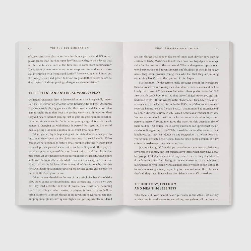 The Anxious Generation'da Haidt, 2010 ile 2015 yılları arasında çocukluk ve ergenliğin nasıl yeniden yapılandığını gösteriyor. Gençler, katlanır telefonlarını sosyal medya uygulamalarıyla dolu akıllı telefonlarla değiştirdikçe, çevrimiçi geçirilen süre -kişinin kendisini çok sayıda başkasıyla kıyasladığı zaman da dahil- fırladı. Yüz yüze arkadaşlık ve aileyle geçirilen zaman ise sert bir düşüş gösterdi ve ruhsal sağlık da öyle.