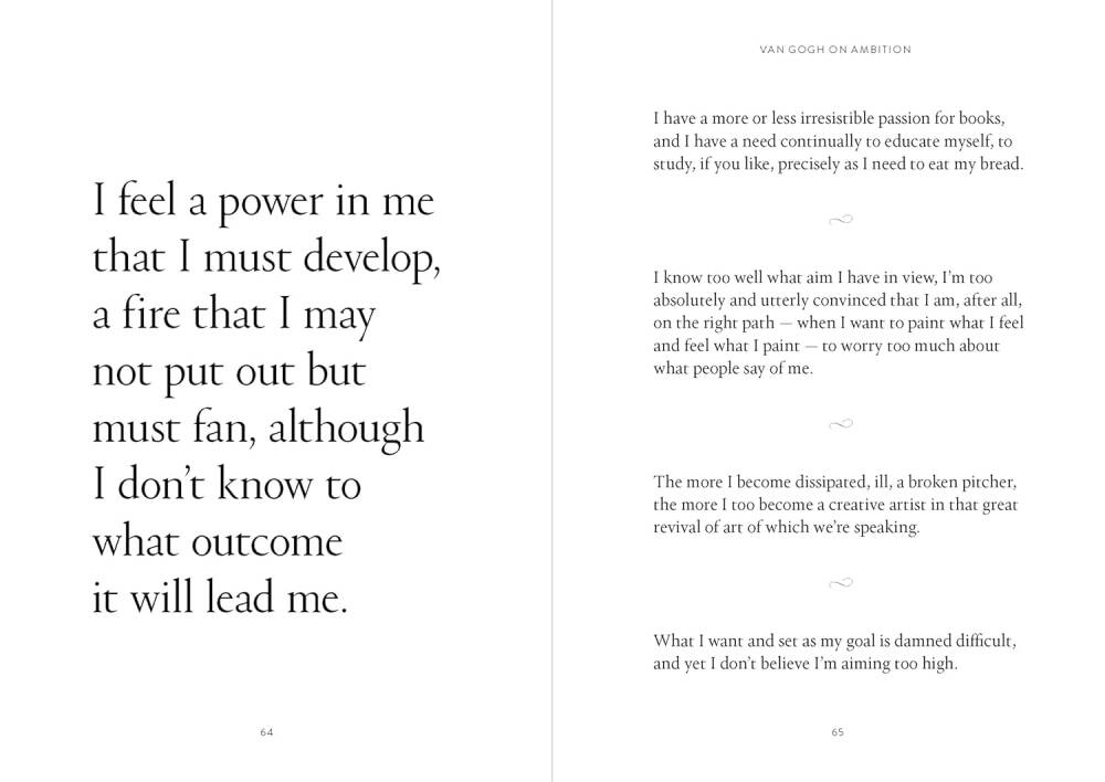 ‘O kadar çok insan var ki [...] kelimelerin hiçbir şey olduğunu sanıyor. Aksine, sizce de bir şeyi iyi ifade etmek, bir şeyi güzel resmetmek kadar ilginç ve zor değil mi? Çizgi ve renk sanatı vardır, ama kelimelerin sanatı da aynı şekilde kalıcı olur.’ – Vincent van Gogh