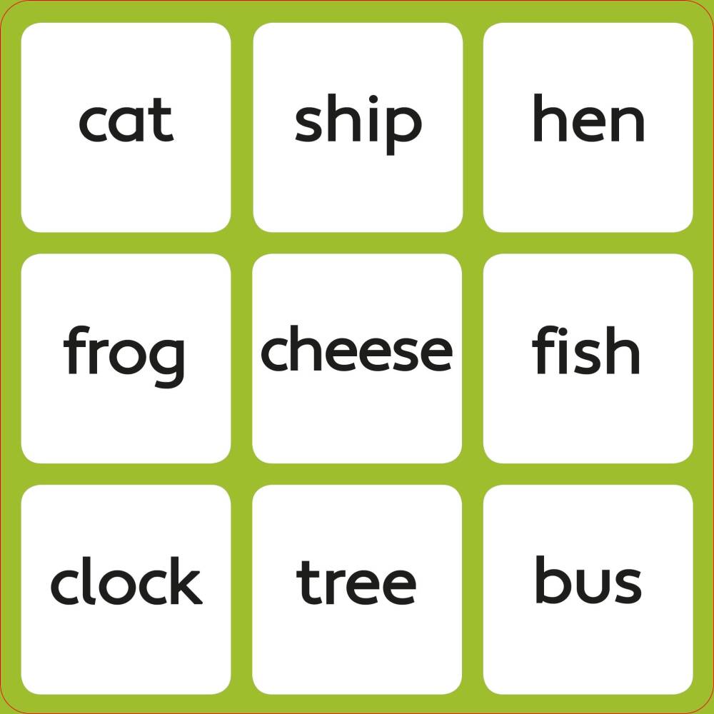 4 bingo tahtası, 36 resimli kart ve bir kitaptan oluşan bu renkli oyunlar, küçük çocukların ilk kelimelerini öğrenirken eğlenmeleri için ideal bir yoldur. Canlı resimlerle süslenmiş kitap, tahtalarda ve kartlarda yer alan kelimeleri ve resimleri tanıtır ve 2-5 oyuncu için uygun olan iki farklı hafıza oyunu talimatlarını içerir. Basit üç harfli kelimelerden daha uzun ve karmaşık ses birleşimlerine kadar çeşitli kelimeler, harfler ve sesler üzerinde pratik yapma imkânı sunar.