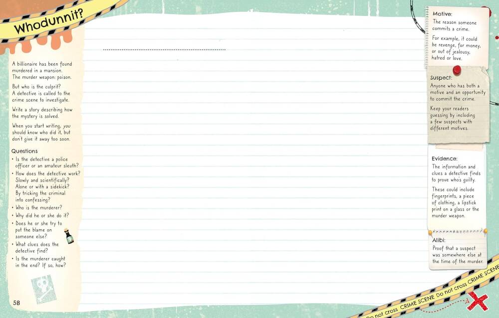Bir okul günlüğü oluşturmak, bir çizgi roman yazmak ve bir resmin etrafında hikaye kurmak gibi pek çok farklı yazma etkinliği içeriyor. Yazma ipuçları ve genç yazarları teşvik eden bir “hikaye yazma araç seti” ile dolu. Kitap, yazarken engel olmayan gizli spiral ciltlemeye sahip, böylece kitap tamamen açılabiliyor.