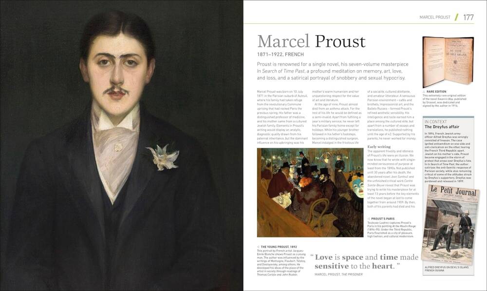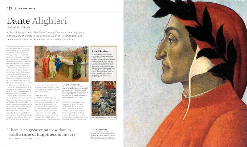 Bu edebiyat rehberinde, her yazar gerçekçi bir portre ve biyografik girişle tanıtılıyor; arkadaşlıkları, aşıkları ve eserlerini etkileyen rekabetleri takip ediliyor. Böylece, yarattıkları büyük karakterler, çarpıcı kurgular ve etkileyici mekânlar hakkında derinlemesine bir bakış sunuluyor. Her giriş, bireylerin temel fikirlerini ve çalışma yöntemlerini inceliyor ve yaşadıkları yer ve dönemi bağlamında sunarak güçlü bir tarihî atmosfer aktarıyor.